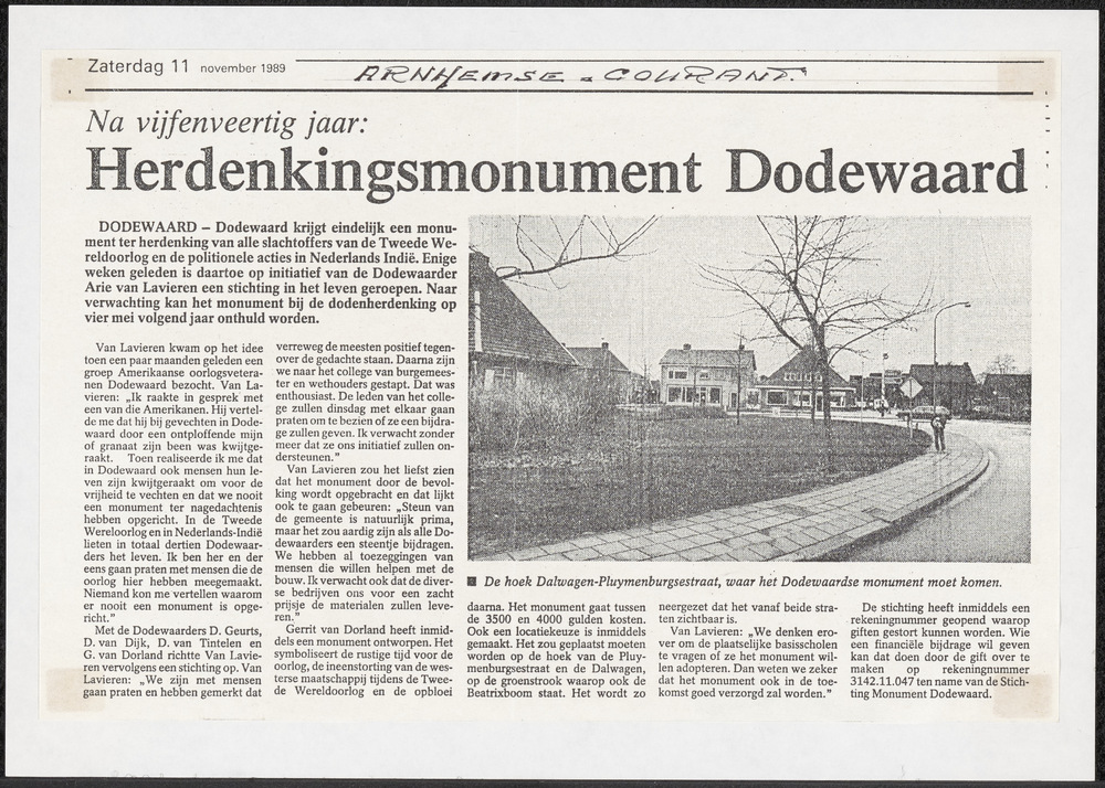 Krantenartikel, monument Dodewaard krijgt gestalte."Gemeente wil ook comité herdenking."