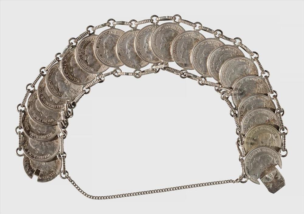 schakelarmband gemaakt van munten van 5 cent met daarop de afbeelding van Willem III, jaartallen 1850-1887