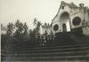 Nederlands Indië 7 December Divisie; drie militairen en Indische jongen op de trappen naar een toegangspoort, palmbomen op achtergrond