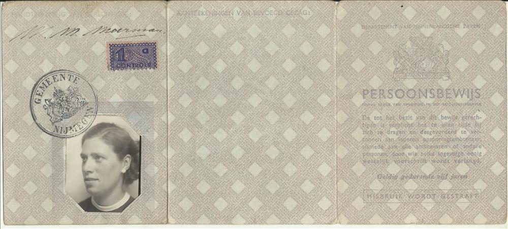 Persoonsbewijs op naam van Margaretha Pieternella Kaldenberg. "Geboren op 2 mei 1899 te Nijmegen. "Afgegeven te Nijmegen op 18 juli 1941" "Document zonder foto"
