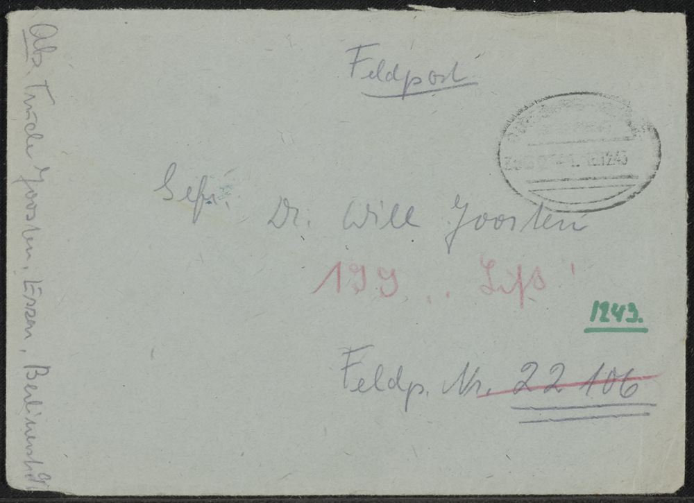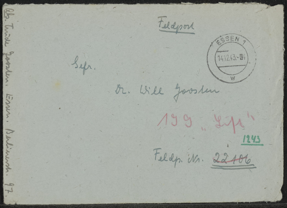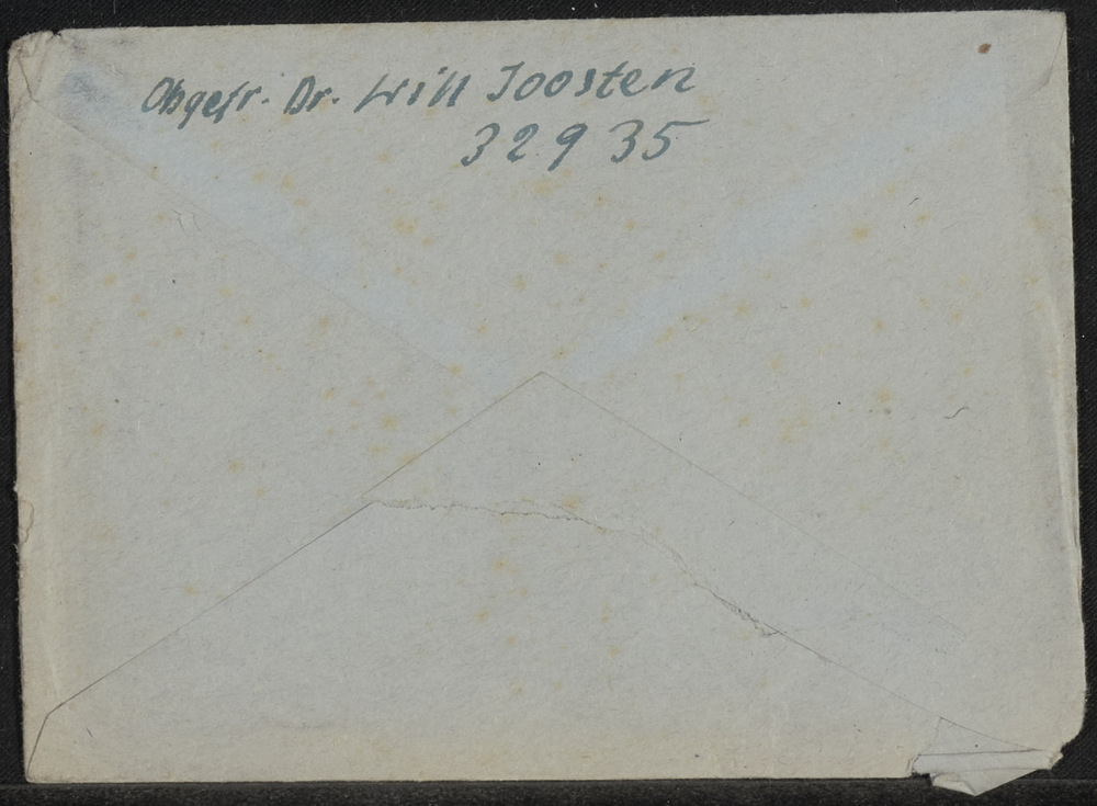 Grijze Envelop gedateerd 25.4.'44feldpost.aan Frau Trude JoostenKalkar 22 b. KleveNiederrhein.Afz. : Obergfr. Dr. Will Joosten 32935Rode Stempel "Nachgebühr"