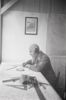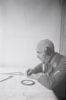 Een Luftwaffe-militair met een vliegercap (Fliegerhaube) met koptelefoon oefent op een plottafel met plotkaart (Gradnetrzkarte)