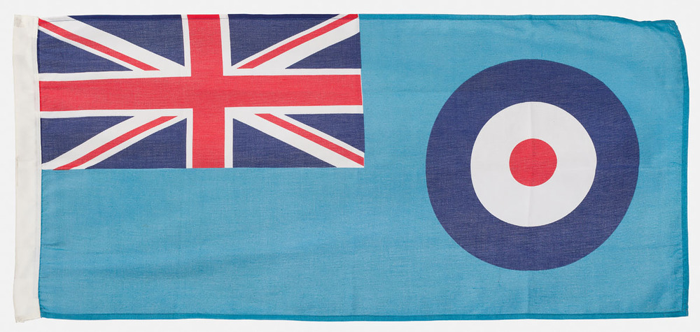 vlag, hemelsblauw; In een hoek de Britse Union Jack, aan de andere zijde het embleem van de Royal Air Force, afmeting : 1.30 x 0.60 m.