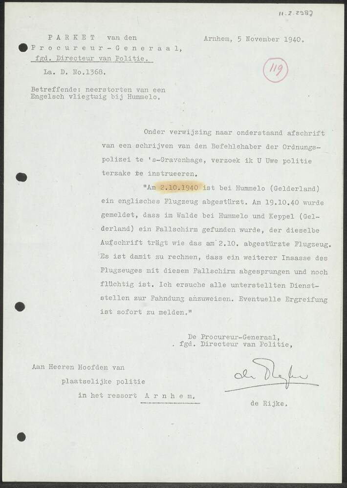 Telegram van 27-10-1940 van LBD1940 's Gravenhage i.v.m. neerstorten van een Engels vliegtuig bij Hummelo. Telegram naar Hoofd van den Luchtbeschermingsdienst Amsterdam op 28 oktober 1940. Neerstorten van Engels toestel P4964 op 2 oktober 1940 in een bos tussen Hummelo en Keppel.