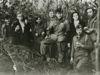Groepsfoto van ondergedoken Amerikaanse parachutisten en Nederlandse vrouw en man in bos. Tekst achterop: "Foto Joop Thuring via Mevr. Dekker-van Zeeland tussen 21 en 24-10-1944".
