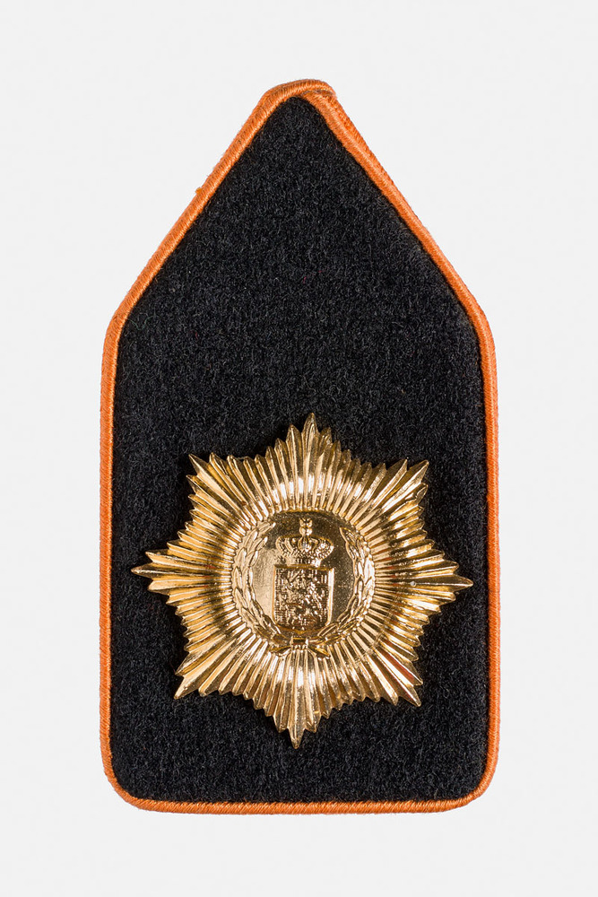 Nederlands. Kraagspiegel. Regiment Limburgse Jagers. Na-oorlogs. Donkergroene kraagspiegel met karmozijnrode rand. Daarop het embleem van het Regiment Limburgse Jagers. De kraagspiegel is gemaakt van kunststof. Aan de achterzijde van het embleem zijn twee boutjes bevestigd die door de kraagspiegel zijn gestoken. Door middel van twee (ontbrekende) moertjes wordt het embleem dan op de kraagspiegel bevestigd. Deze kraagspiegel dient op de linkerzijde van de kraag gedragen te worden (de beker van de jachthoorn dient omhoog te wijzen).