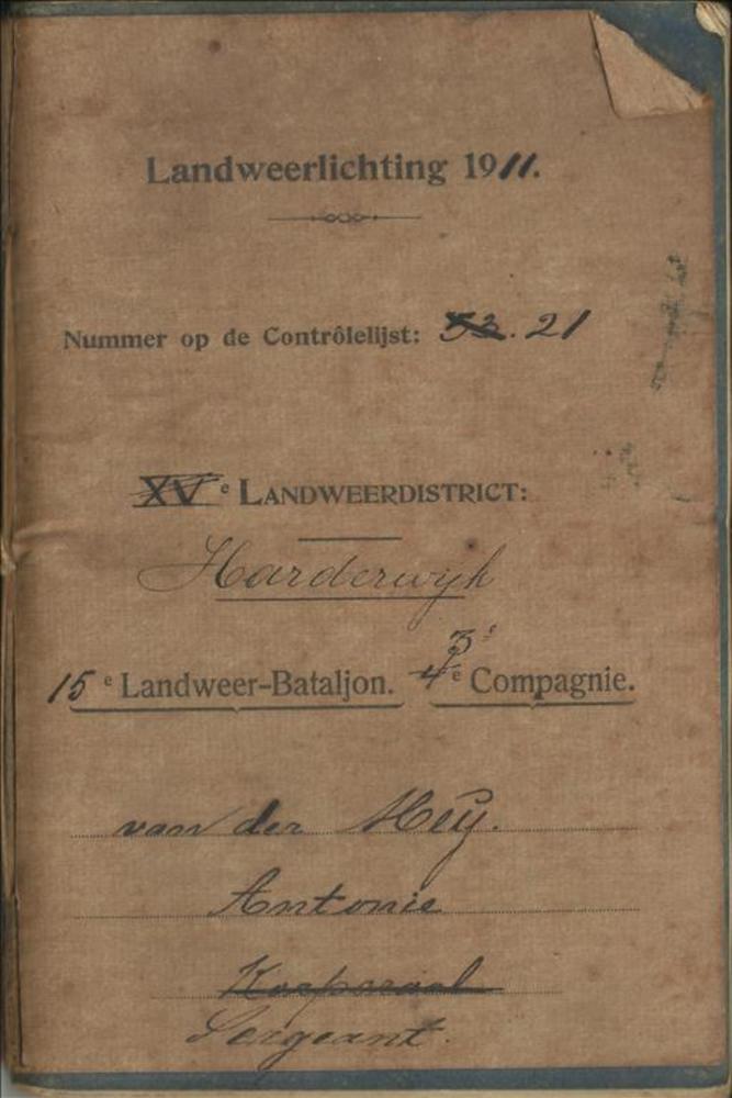 zakboekje, Landweerdistrict Harderwijk, 15e Landweer-Bataljon 3e Compagnie, van A. van der Meij "1 augustus 1911" "Antonie van der Meij geboren op 14 mei 1882 te Deventer"