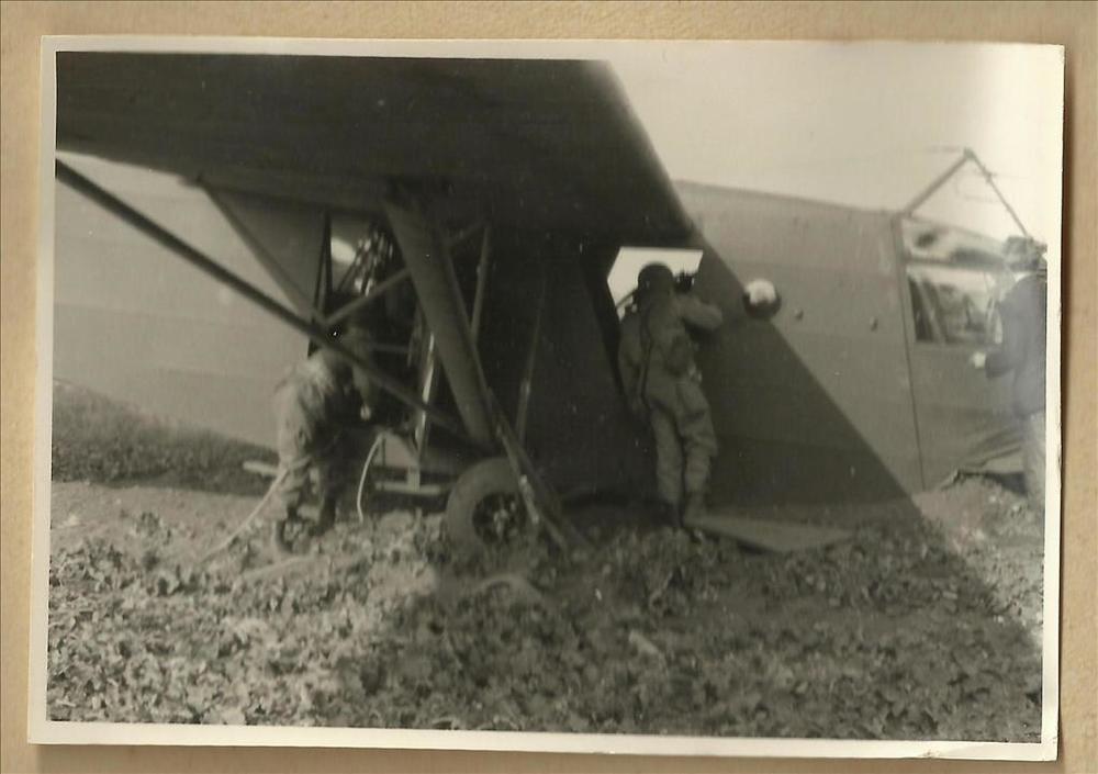 Foto glider op Moker Hei Malden, 19 september 1944 onderschrift 'zweefvliegtuig waar een jeep uit komt (op de moker hei)
