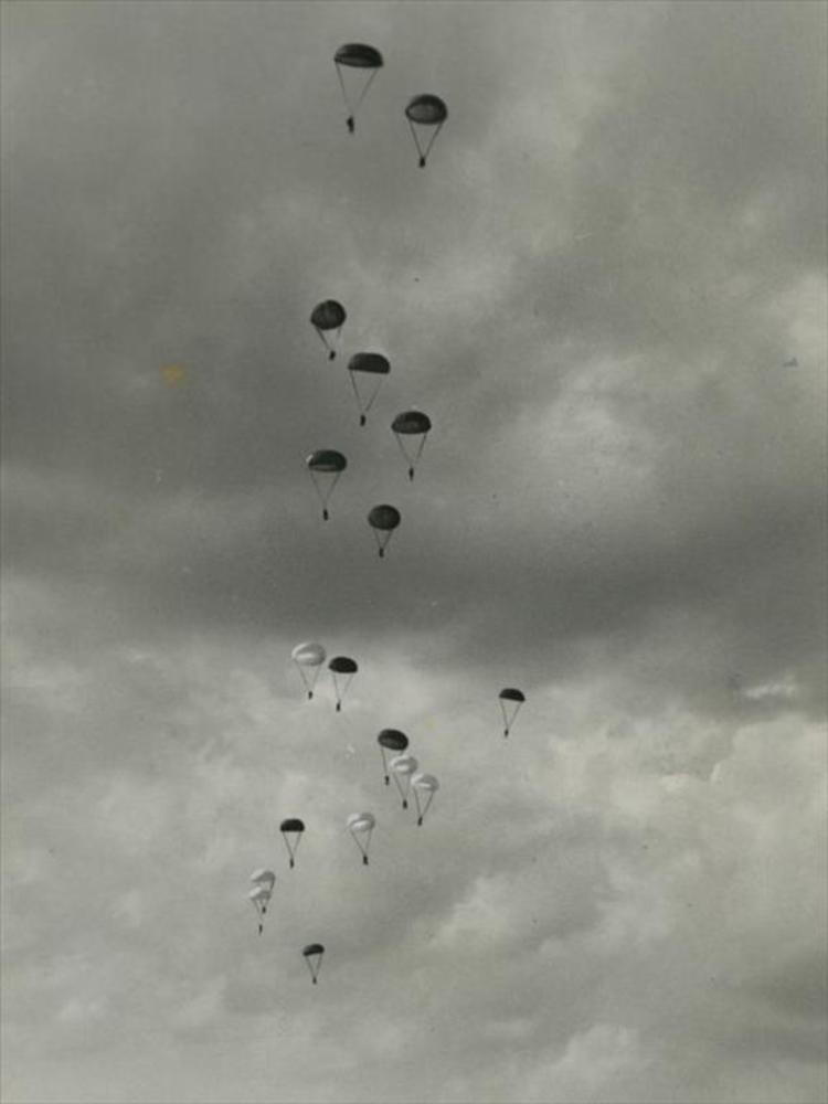 dalende parachutist met rood-wit-blauwe koepel parachute