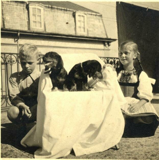 Schiedammer Willem van Tricht met zijn pleegzusje Ursula Kocher en de honden Bella en Boy in Zwitser...