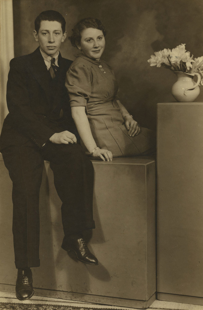Een portret van twee jonge mensen poserend in het decor van Foto Conens in Hoogezand.