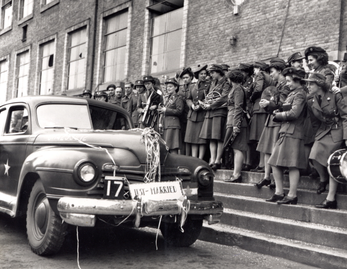Een Canadese militaire vrouwenkapel kijkt vanaf de trappen van het Klein Seminarie toe bij de bruiloft van twee collega's.