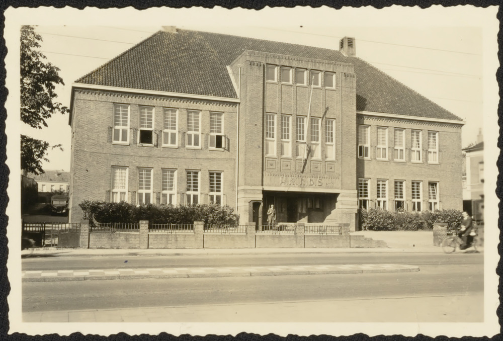 Op de foto de R.K. H.B.S. aan de Velperweg in Arnhem met een Duitse soldaat op wacht. Het vroegere onderkomen van de Ln. Kompanie ...
