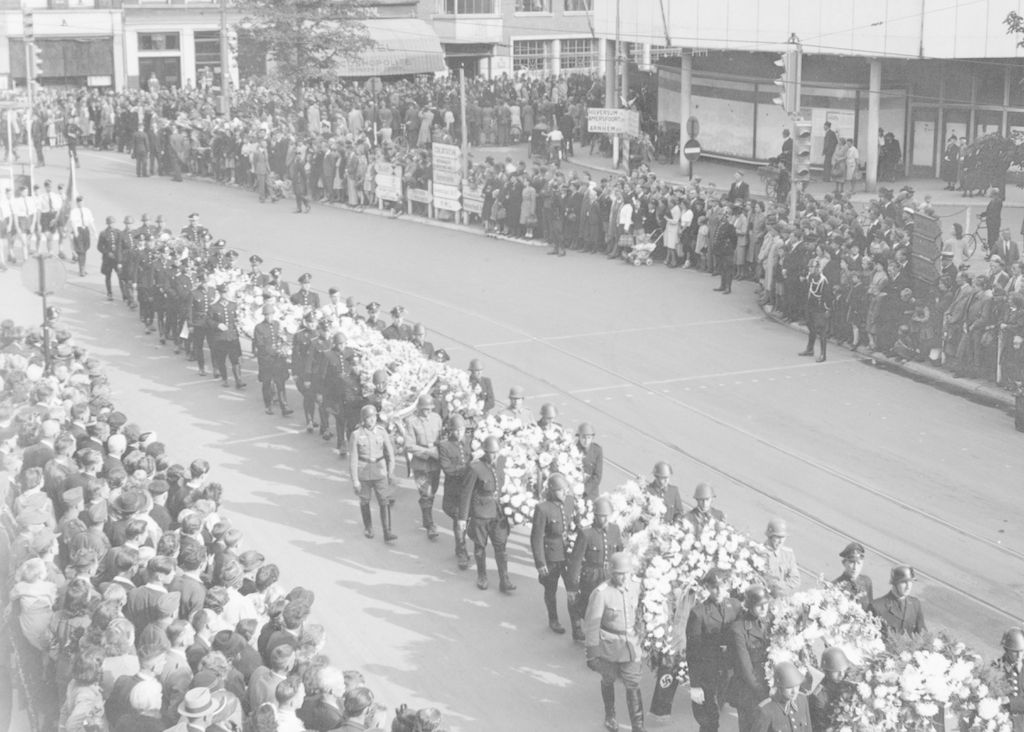 Afbeelding van de stoet met rouwkransen in de Potterstraat te Utrecht ter gelegenheid van de begrafenis van de vermoorde Utrechtse ...