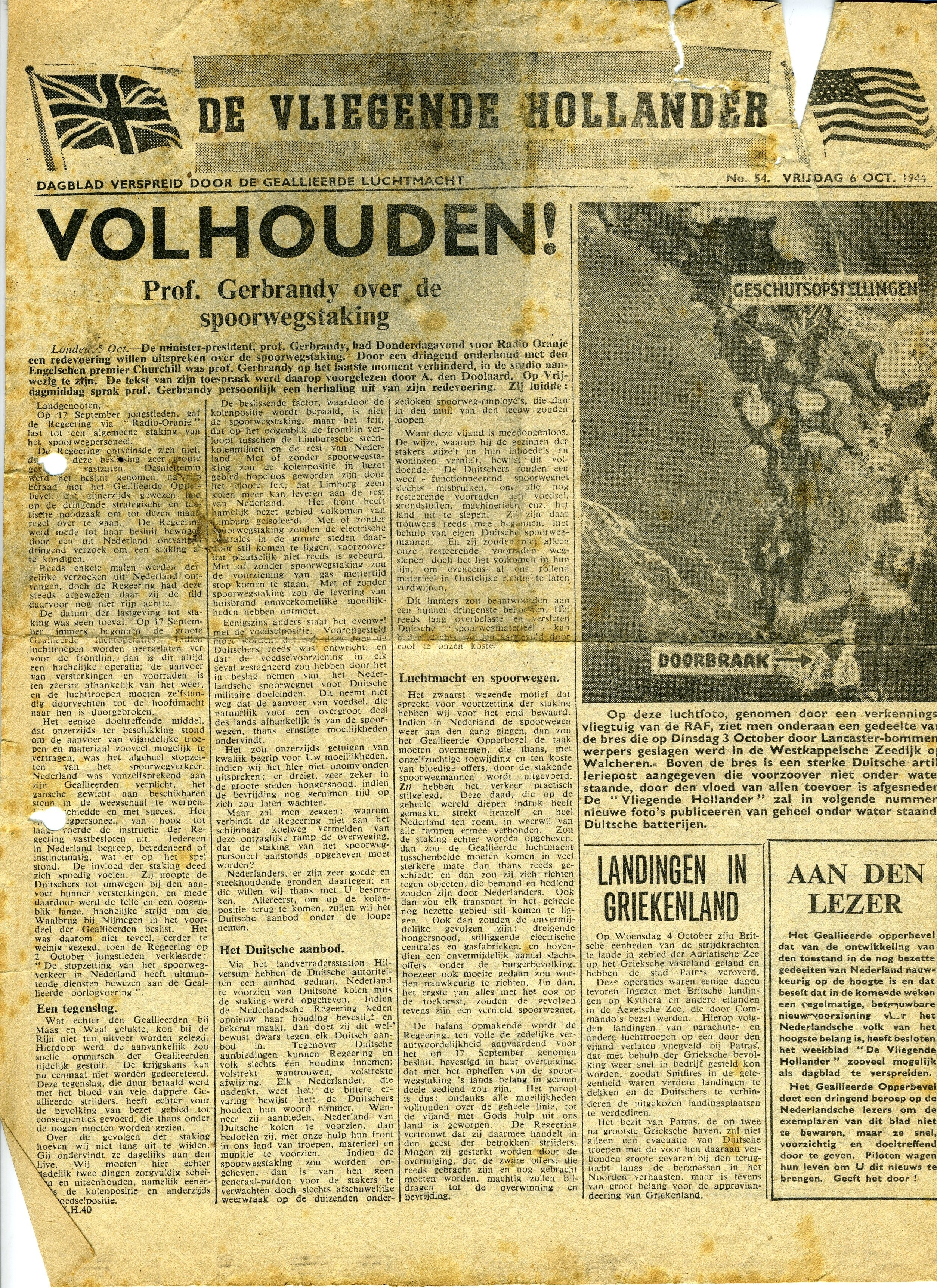 De Vliegende Hollander, No 130, 23 april 1945. 'Russen vechten in Berlijn' 'Geallieerden aan de Grebbelinie' 'Blokzijl gearresteerd'. een nieuwsblad dat door de geallieerde vliegers boven Nederland werden uitgeworpen. De redactie werd verzorgd door medewerkers van Radio Oranje