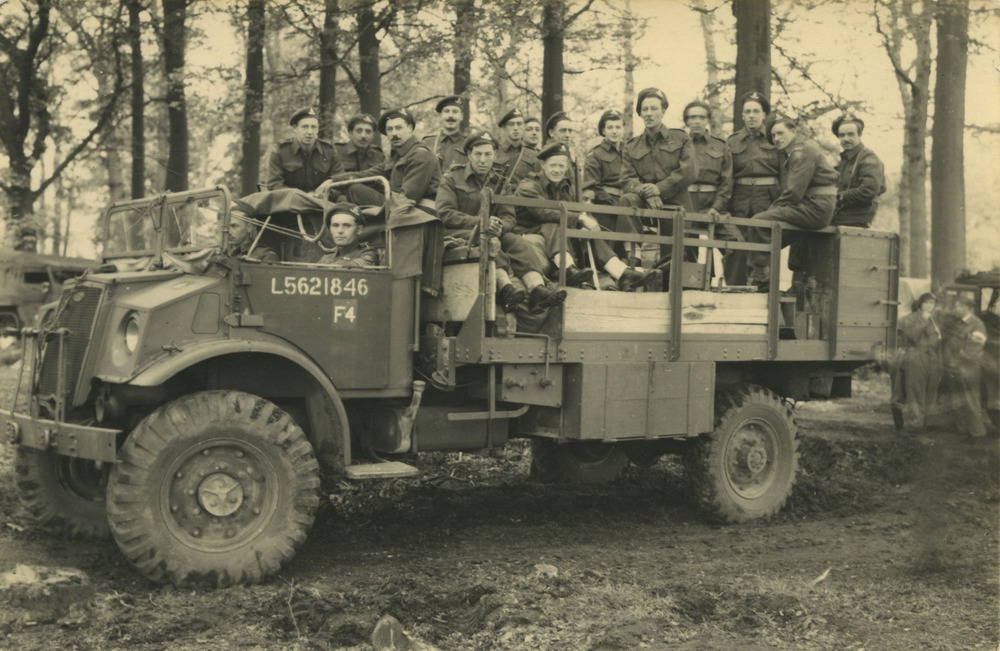 'Engelsen, mei 1945, 2 leden BS.' Canadese soldaten in een vrachtwagen (Canadese Chevrolet) + 2 leden van de binnenlands...
