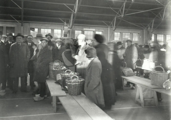 Handelaren achter een schraag in de eierhal. Bekende handelaren waren onder anderen de heer Groothedde en de heer Vreugdehil