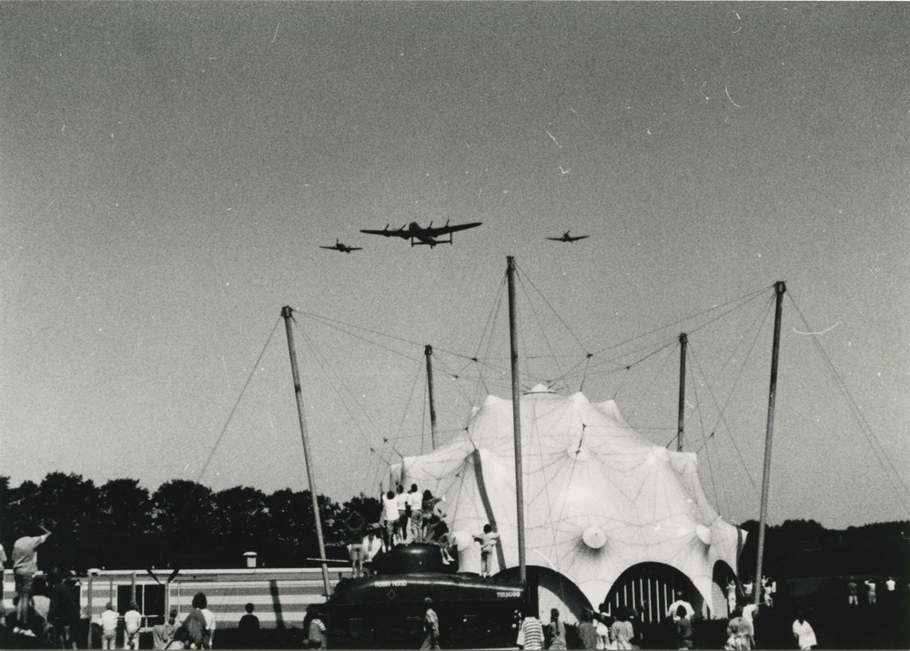 Foto van Spitfire, Hurricane en Lancaster van de RAF Battle of Britain Memorial Flight boven het museum