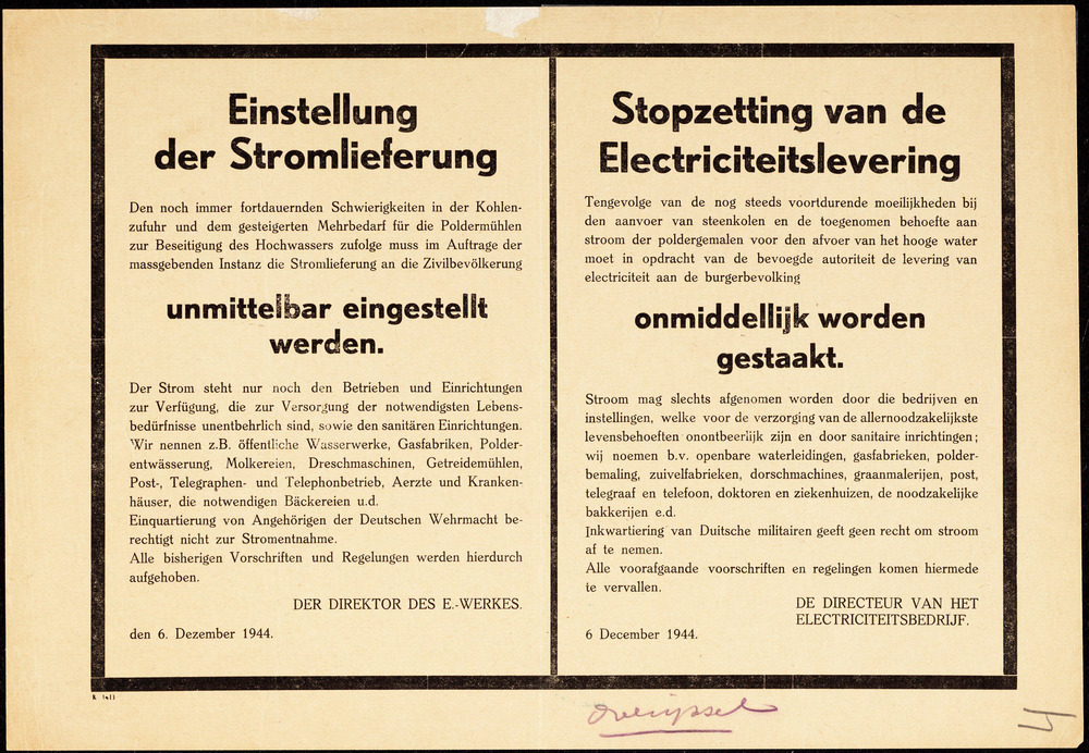 Clandestiene elektriciteitsvoorziening. Elektriciteitsnet. In december 1940 werden gas en elektra gedistribueerd.