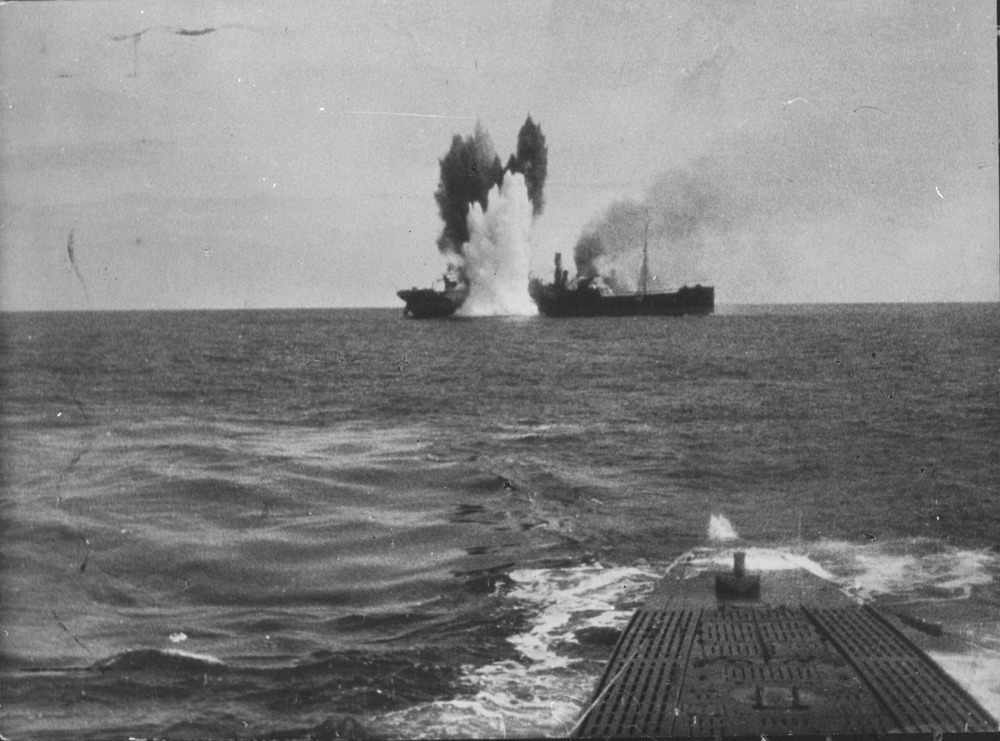 Engelse vrachtboot door Duitse vlirgtuigen tot zinken gebracht.