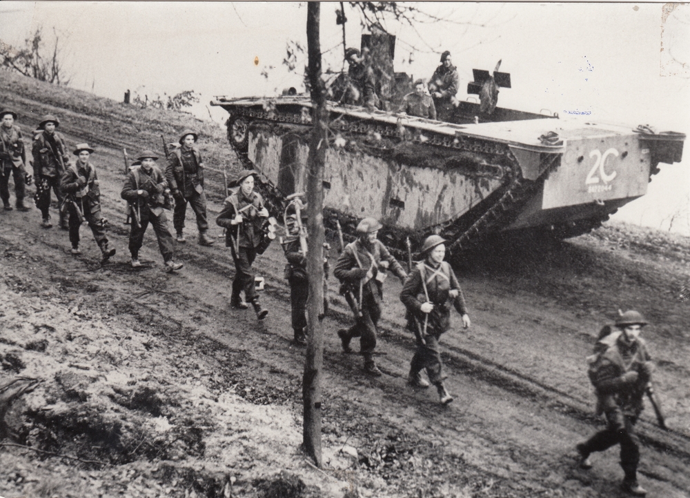 Foto van Canadese soldaten (mogelijk bij het Hollandsch-Duitsch gemaal) in Nijmegen