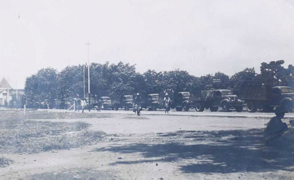 Een colonne vrachtwagens rijdt door Soerabaja, augustus 1946. De foto is afkomstig van marinier P.