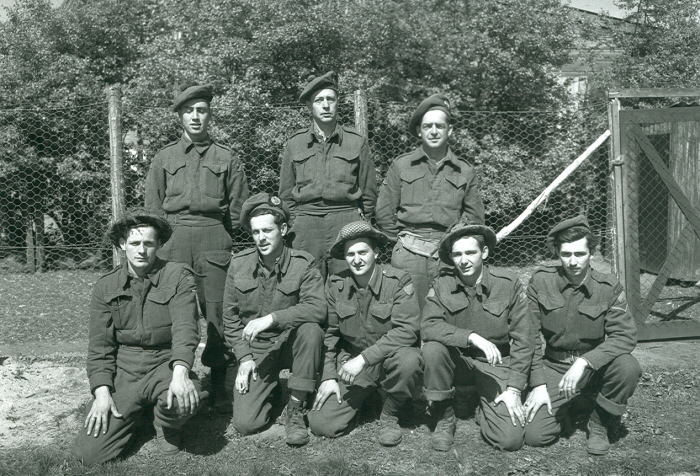 Groepsfoto van een deel van de manschappen van de 48th Highlanders of Canada voor vertrek uit Apeldoorn.