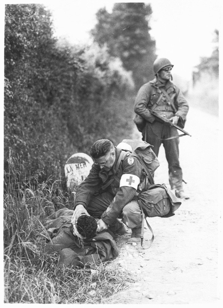 Een legerarts van het 9de Amerikaanse leger verpleegt langs de weg bij Carentan een gewonde soldaat die door een Duitse ...