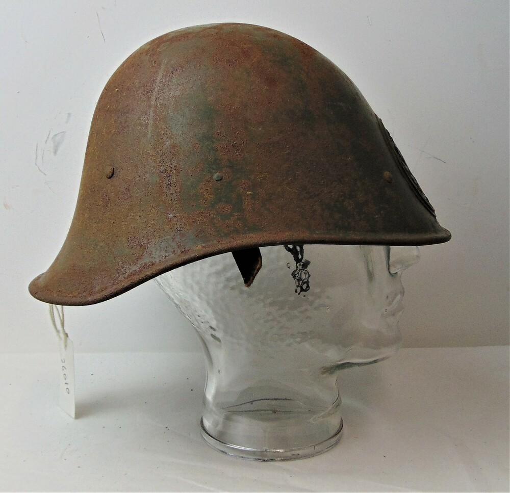 Helm, Nederlands zonder leeuwembleem, met binnenwerk, kleur was zwart, is amateuristisch wit geverfd met de letters 'MP' op de voorkant aangebracht Militaire Politie?