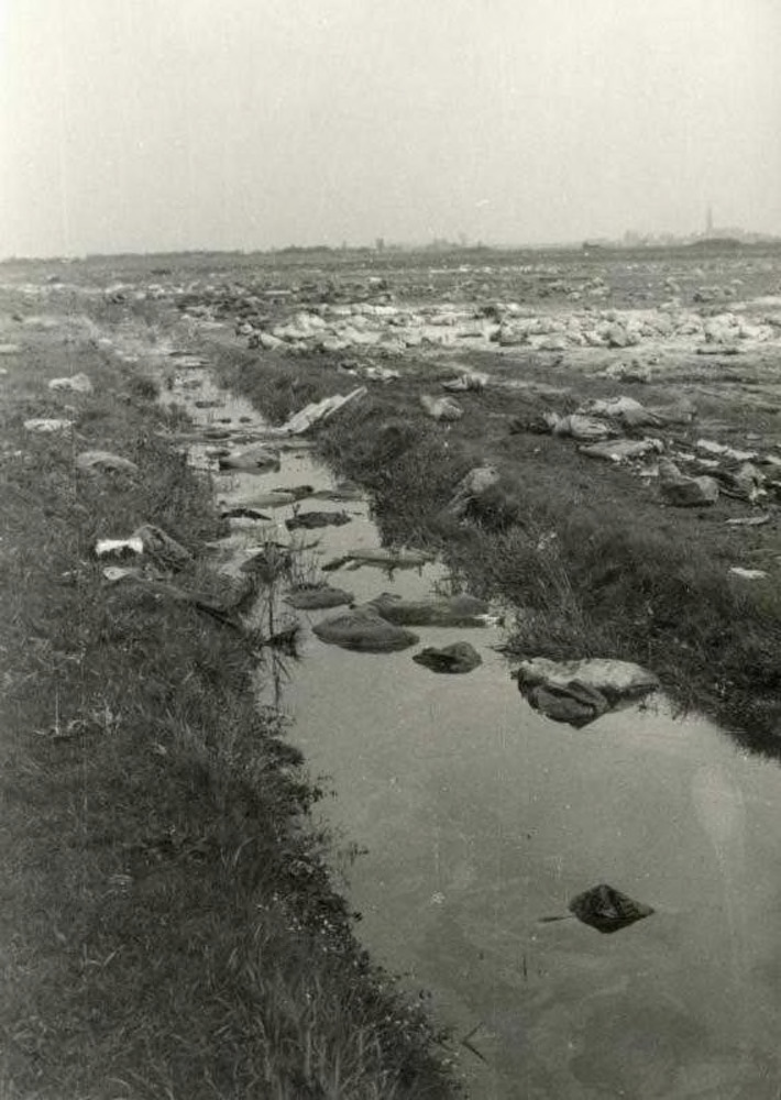 Voedseldroppings. Jutten zakken met voedselpakketten liggen verspreid over het veld en deels in de sloot.