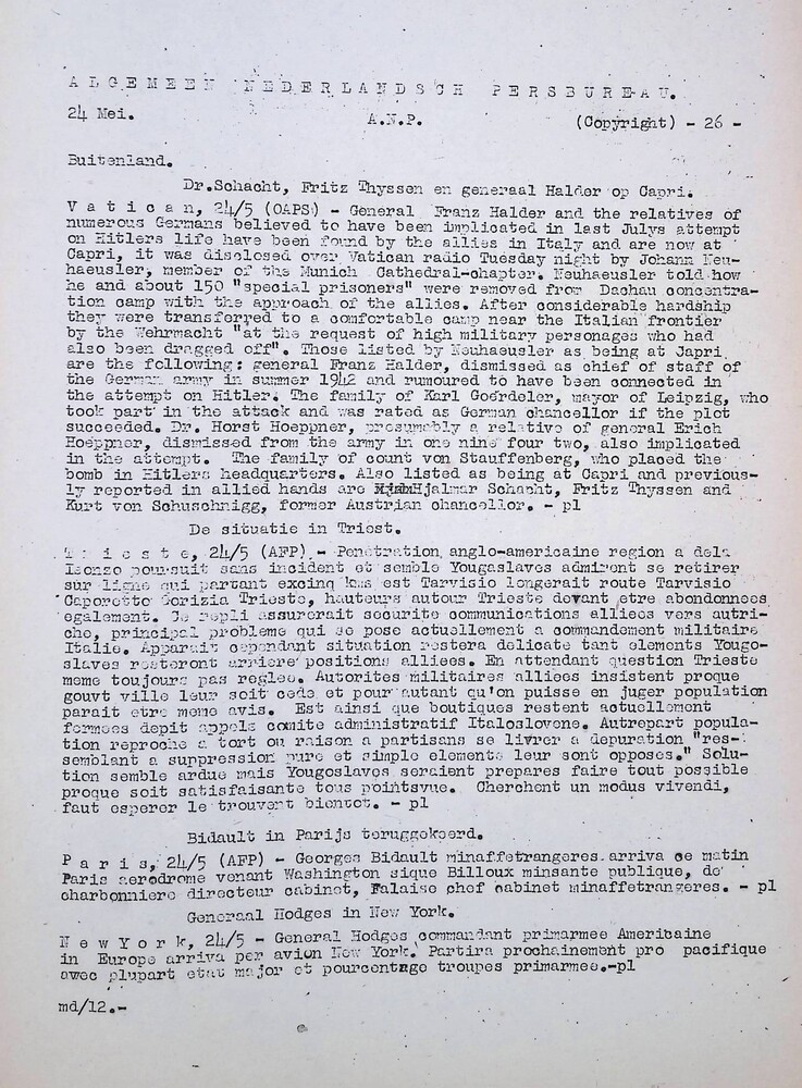 Vel: Algemeen Nederlandsch Persbureau, mededelingen, 9 juni 1945 (51)