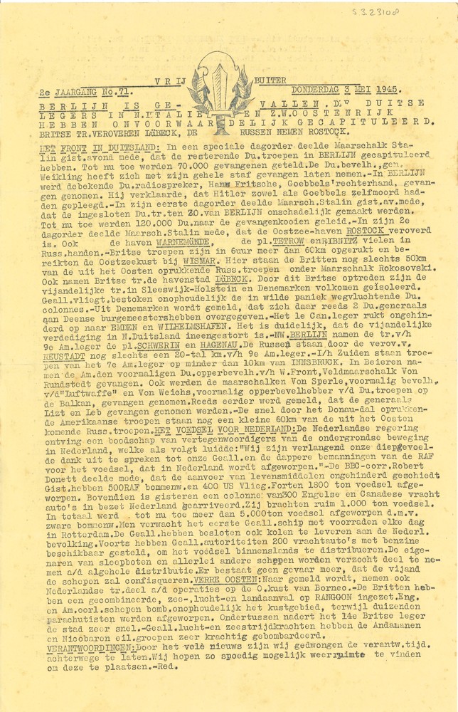 De Vrij Buiter, 2de jaargang, No 71, 3 mei 1945. 'Berlijn is gevallen' 'De Duitse legers in Italië en Zuid West Oostenrijk hebben onvoorwaardelijk gecapituleerd' 'Britse troepen veroveren Lübeck en Russen en nemen Rostock in'