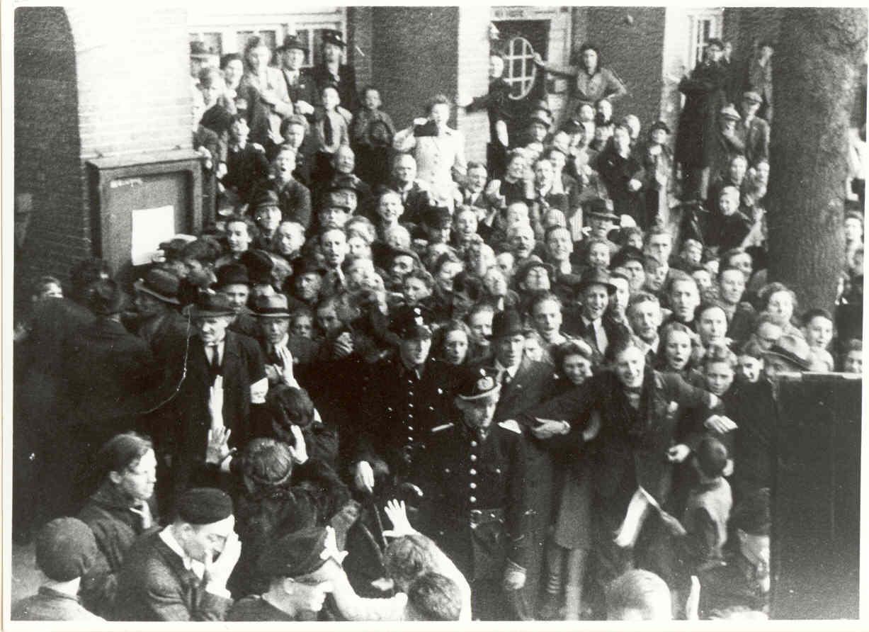 Zwart-wit foto van een menigte toeschouwers en de aflevering van gearresteerde NSB-ers bij het politiebureau aan de Deventerstraat ...