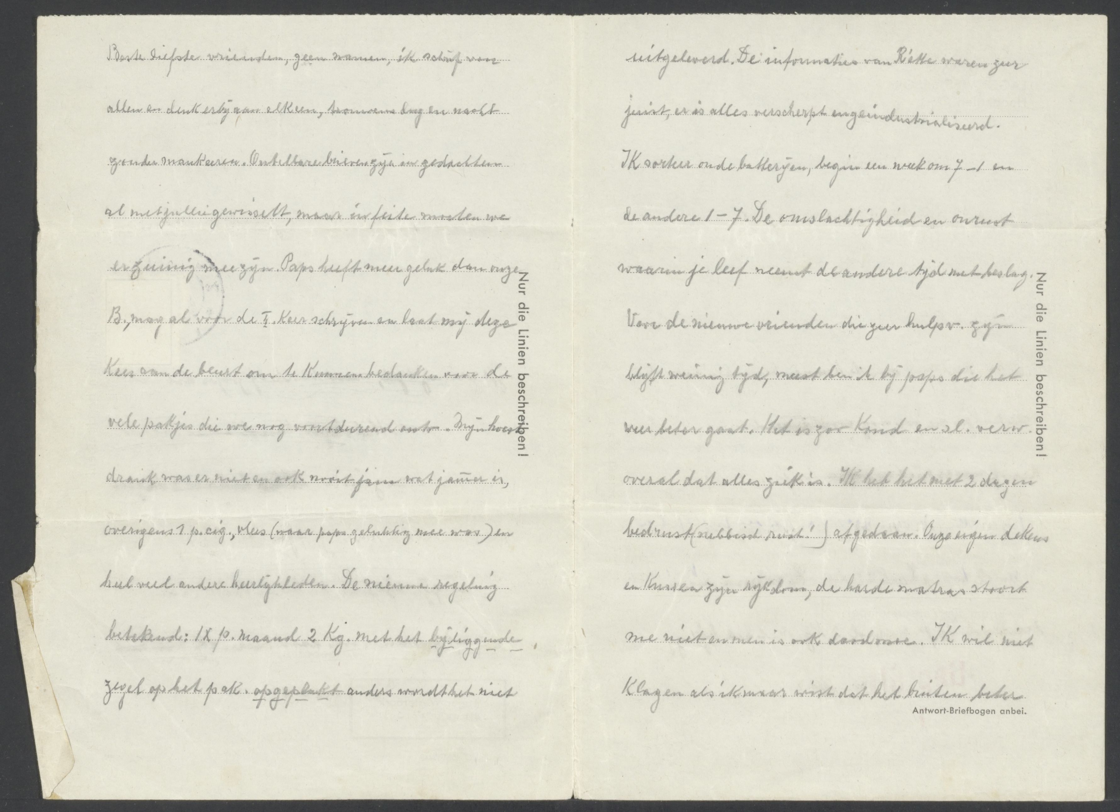 Van: Vries, de, Moritz, Fam. Aan: Boer, de, Fam. Plaats: Westerbork, kamp Datum: 1942-07-22 Onderwerp: sturen van pakketten, transporten; het gaat om Duits-Joodse vluchtelingen, die behoren tot de oorspronkelijke bevolking. De schrijver, die al sinds 1940 in het kamp zit, geeft een summier beeld over de onrust in het kamp tijdens de transporten van de eerste week vanaf 15 juli 1942. Als kampbewoner/kampgevangene ...