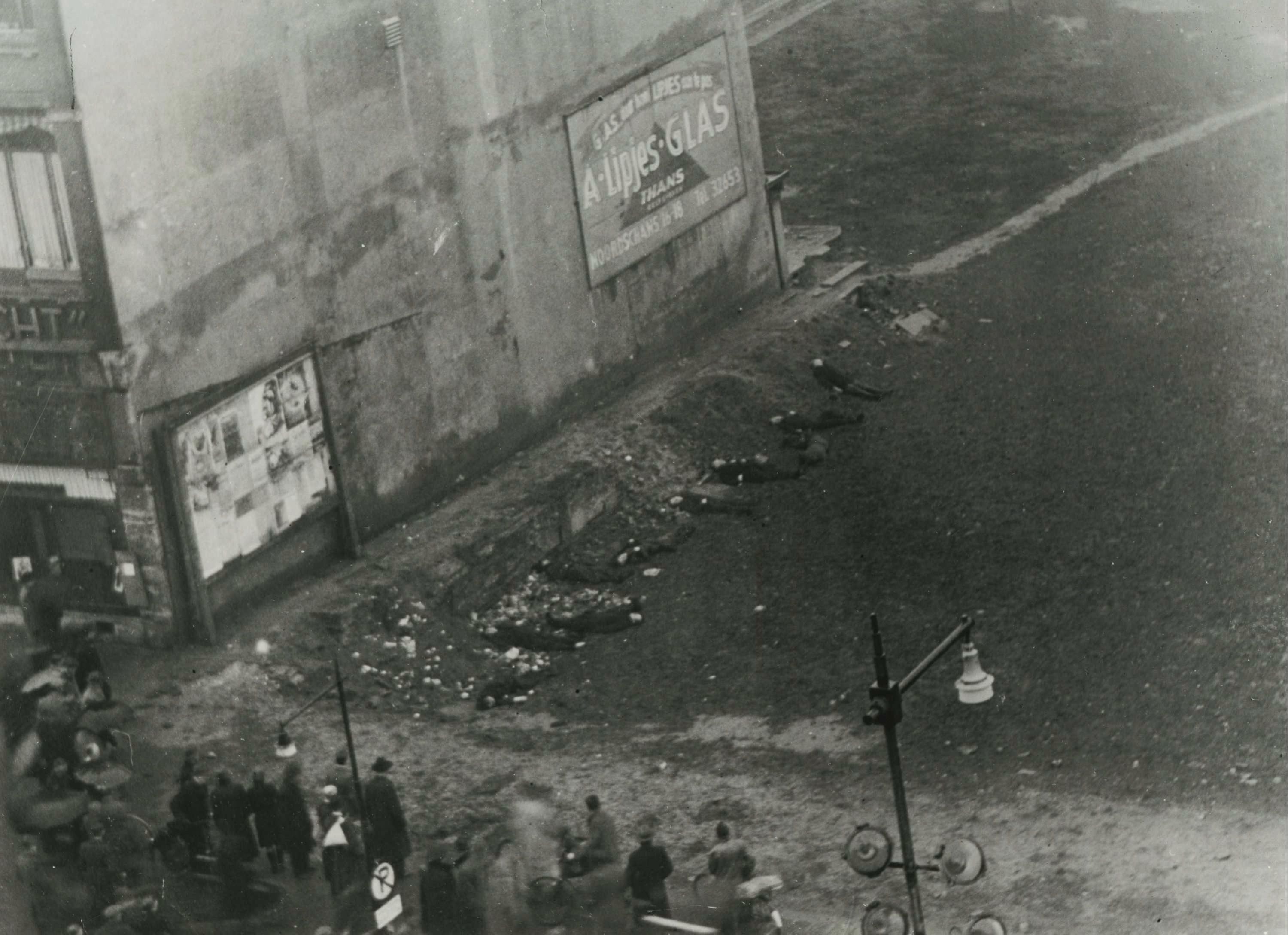 De fusillade van tien verzetslieden tegen de zijkant van het gebouw 'De Utrecht' aan de Coolsingel te Rotterdam, als vergelding voor de aanslag op SS'er Hermann Heinrich Pennings de dag ervoor. Na de executie blijven de lichamen nog tenminste een dag liggen.