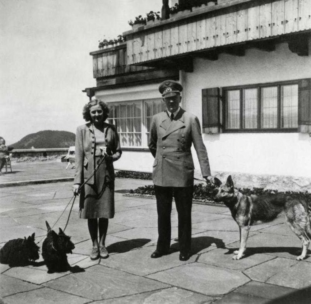 Tweede Wereldoorlog. Adolf Hitler en Eva Braun met hun honden, 'Blondi', 'Negus'en 'Stasi' bij het zomerhuis Berghof.