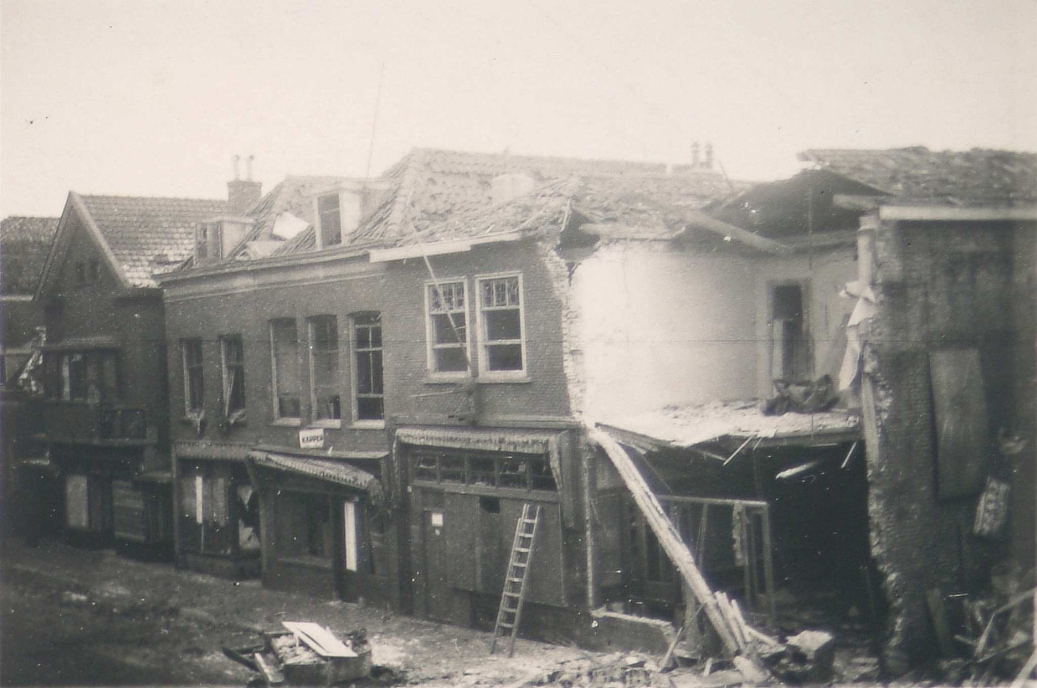 Door het bombardement in mei 1940 beschadigd havenkantoor op de Draai, nummer 7, gezien vanaf de Bin...