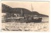 Afbeelding in zwart-wit met daarop als voorstelling een blik op de zuidelijke oever van de spoorbrug over de Waal bij Nijmegen. Links op de voorgrond een Duitse soldaat, rechts op de oever zijn collega's. Meer op de achtergrond mensen die zich verzamelen bij een 'kassa' voor vervoer naar de overkant van de Waal. Op de achtergrond de op 10 mei 1940 opgeblazen Waalbrug, waarvan het middengedeelte in ...