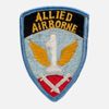 mouwembleem, Amerikaans, First Allied Airborne Army. Replica. Eerste geallieerde luchtlandingsleger. Lichtblauw embleem met aan bovenzijde in zwart vlak met gele letters 'Allied Airborne'. Daaronder een witte 1 met gele vleugels. Daaronder in een rode driehoek twee witte gekruiste zwaarden.