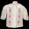 Blouse, korte mouw, van parachute zijde. Op mouwen en voorpand kruissteek borduursel