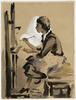 Portret van een jonge vrouw, en profil naar links, zittend achter een schildersezel met penseel en palet in de hand. Zij is aan het schilderen.