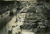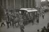 Op bruin papier geplakte zwart-wit foto van de bevrijdingsoptocht bij HGB III ofwel 'De Inktpot' in Utrecht In de stoet rijdt een paardenwagen mee met passagiers er in. Om de wagen heen lopen mensen mee. Op de voorgrond is een vrouw te zien met een mand aan de arm. De wagen wordt getrokken door een paard. Langs de weg staat publiek. Om de foto heen is met een blauw stempel twee keer 'geen negatief' ...