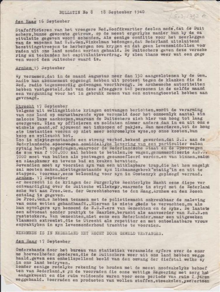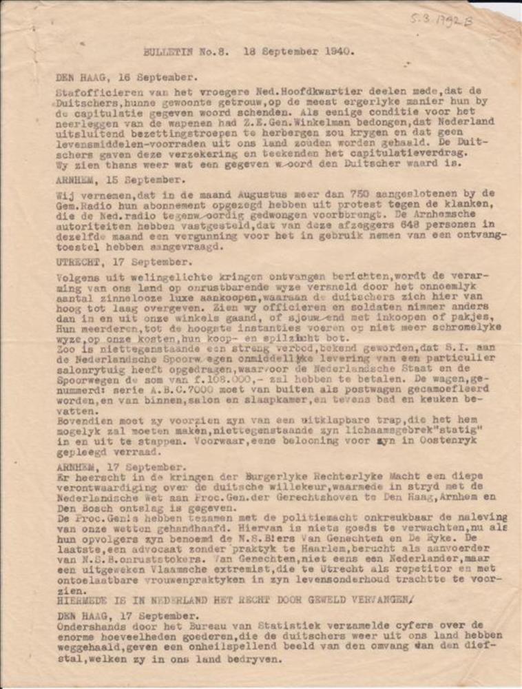 Bulletin No 8 : 18 September 1940 , 4 Exemplaren. ( 3e Exemplaar) De Haag 16 september / Arnhem 15 september / Utrecht 17 september / De Haag 17 september / Nederland leert haten .