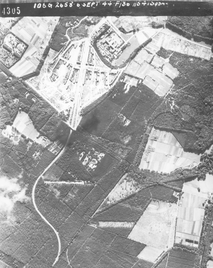 Arnhem: Cattepoelseweg (van onder naar boven, links van het midden), Schelmseweg, Openluchtmuseum, Burgers Dierenpark, Begraafplaats Moscowa, Gemeenteziekenhuis, Duitse militaire begraafplaats (Ehrenfriedhof Zypendaal tussen de Schelmseweg en Deelenseweg)