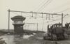 Op bruin papier geplakte afbeelding in zwart-wit van verschoven rails bij een ondergelopen deel van het baanvak bij Lage Zwaluwe. Links en rechts van het spoor ligt modder en water dat is overgebleven na een overstroming. Een deel van de portalen boven het spoor staat scheef, een ander deel staat nog recht.