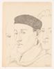 Drie jagers met hond. Twee mannen dragen een geweer. De derde een schop. Voor hen een kist met gaas, gebruikt bij het vangen van een bunzing. Op de kist ligt een dode bunzing. Voor de kist een aantal jonge nestdieren. De foto is gemaakt op een open plek voor een bosje.,