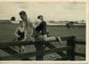 Veldloop door weiland in 1942. J.H. Timmer (1923) springend over een hek. Erachter J.W. Kooijman (1923). Belastingacademie 1942-1948. Zwart-witfoto.