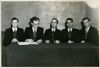 Senaat 1946, Belastingacademie 1942-1948. Met L. Kuyrers, W. Zijlstra, B. Gorter die de voorzittershamer vasthoudt, T. Mottier en H. Wardenier zittend achter een langwerpige tafel. Op tafel een donkerkleurig tafelkleed. Zwart-witfoto.