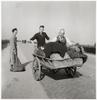 Twee mannen die een handkar met lading voortduwen. Een vrouw, ten voeten uit, links naast hen op de stoep kijkt hen na.