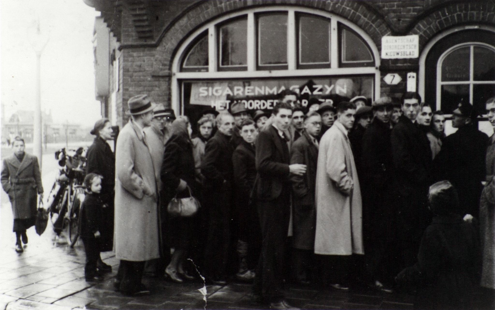 ' Distributiebonnen, vernietigd en weer op nieuw tot papier verwerkt, worden hier van groote rollen tot kleinere gesneden om nog eenmaal dienst te doen, nl als toiletpapier.'